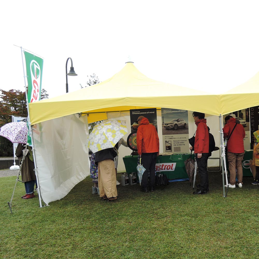 カングーでコラボしている「ダナー」、なぜかスポーツホイールの「OZ」、エンジンオイルの「カストロール」などが出店しています。キッチンカーも来ているので食事には困りません。